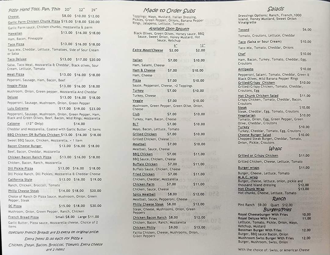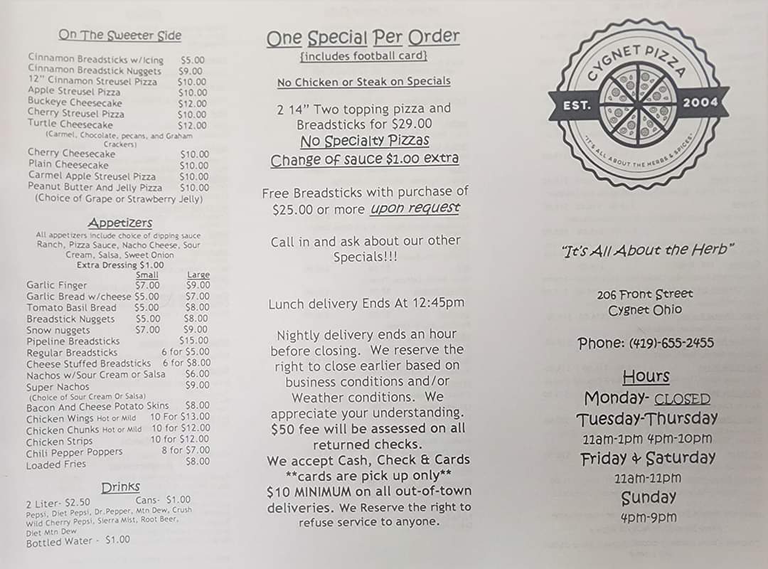 Cygnet Pizza offers a straightforward menu centered on classic, comforting pizza and complementary dishes that feel right at home in a small-town setting. The menu presents familiar favorites like pepperoni pizza alongside unique options such as the caramel apple streusel, making it easy to stop in whether you’re craving a quick bite or a relaxed meal with friends or family.